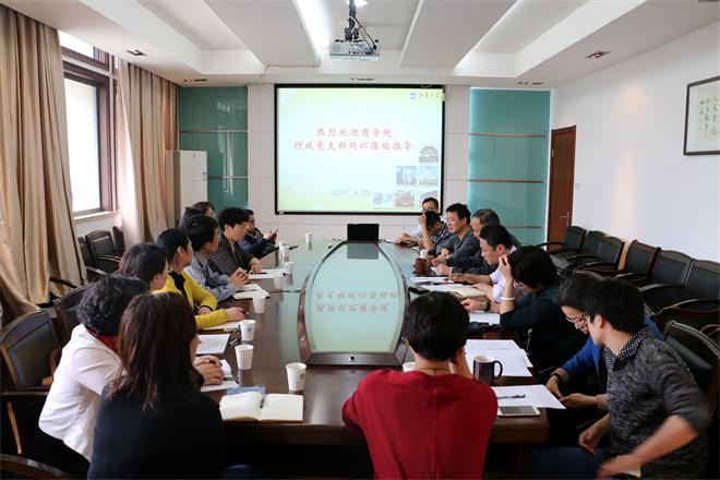 4月20日下午,av麻豆行政党支部与商学院行政教辅党支部在田家炳楼207会议室,就党支部工作进行了交流、学习,商学院党委书记李佳敏、av麻豆党委书记沈贵鹏参加活动并分别致辞。双方就如何结合岗位特点、推进支部“两学一做”学习教育常态化和制度化、提升党员先进性和管理能力,结合贯彻全国高校思想政治工作会议精神,发挥管理育人和服务育人的针对性和实效性,支部特色工作等方面展开了交流,并就各自工作方法等内容进行了研讨。大家普遍认为:作为学院行政教辅支部的党员同志承担着服务于学院教学、科研等主体工作的职能,要坚持和加强“两学一做”学习教育,强化服务意识、大局意识和服务能力,在奉献和服务中体现和发挥党员的先进性,切实践行服务育人、管理育人的宗旨;党支部要把民主生活会等理论学习教育活动与实践性教育活动有机结合起来,提升党支部的凝聚力和先进性。