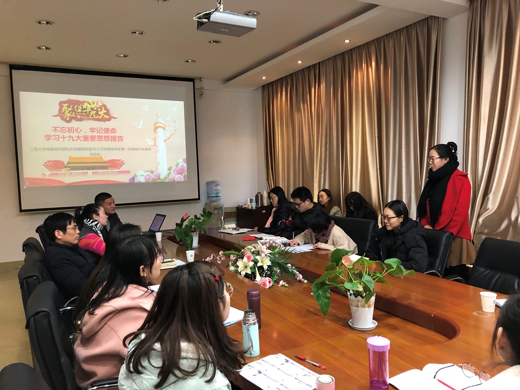 学习交流主要从三个方面展开,包括党章研习、互助讨论和总结发言。首先,组织部、党校和机关党委党支部书记张海峰同志带领全体党员学习了党章。通过PPT展示,图文并茂地讲解了党章做出的每一处改动。带领在座党员回顾党史,梳理每一届党的代表大会精神内涵。党员同志都做了认真的学习。之后,在座同志结合自己的学习、生活纷纷谈了学习十九大精神以及成为党员或预备党员以来的一些心得体会。教育类专业学生普遍对教育使命问题有更多的关注,针对“美好生活需要和不平衡不充分的发展之间的矛盾”问题,探讨了教育方式,新媒体手段在教育资源不平衡的现状下能发挥的积极作用。中文类专业学生着眼于生活中的细节变化,在民生建设,生态保护方面交流了自己的切身体会,提出了自己的思考,并表达了对党切实为人民服务的认识。同时也有同志就文化自信,辩证唯物主义发展观,教育国际化视野做了进一步交流讨论。在学生党员发言的间隙,机关党委书记周建中同志就优秀传统文化,党的纪律性问题针对同学的观点做了一些点评,并引导学生深入思考。