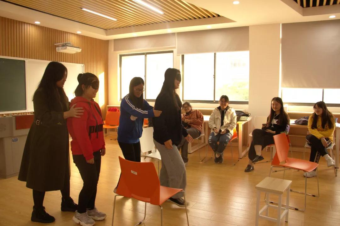接着是以加强信任为主题的培训第二项,通过信任行走的活动,同学们体验了看不见时的感觉以及有同伴带领时感觉的变化。在活动过程中,大家对同伴的理解以及信任感都得到了加强,合作意识也得到了强化。