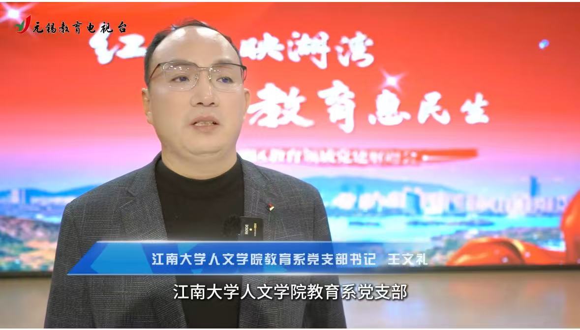 王文礼接受无锡市教育电视台采访,他表示av麻豆教育系党支部充分发挥学科优势、师资力量及党建经验,与无锡市滨湖区七所学校开展党组织共建,通过党建引领、资源共享、专业赋能,实现党建引领“一融双高 ”,推动党建与教育教学、科研创新深度融合,形成“1+7+N”的可持续合作范式。