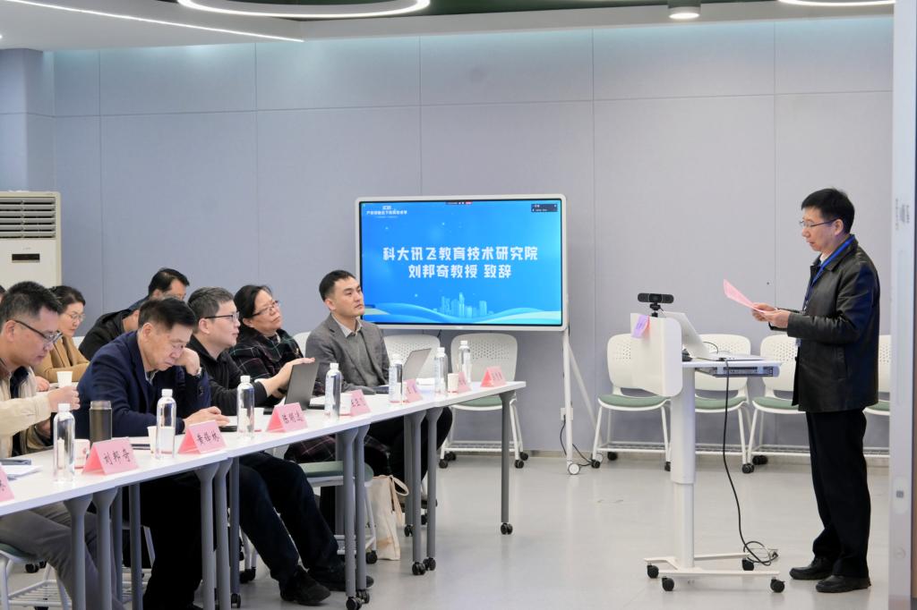 刘邦奇在致辞中强调了国家和社会对智能教育人才的迫切需求,指出应充分发挥高校的学科理论优势与企业的技术实践优势,从而实现产教研融合、助推教育技术学专业向智能化升级。