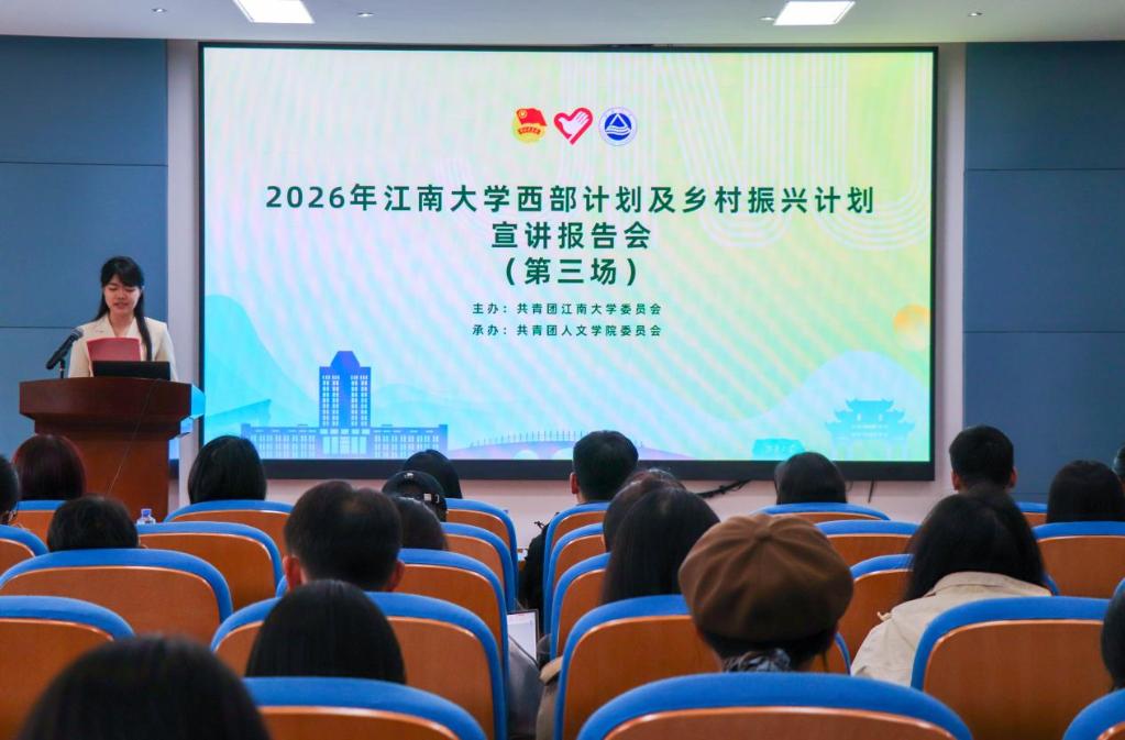 “到西部去,到基层去,到祖国和人民最需要的地方去”这既是青春的召唤,更是青年矢志不渝的誓言。此次宣讲会进一步激励青年们投身基层一线,参与乡村振兴实践,凝聚起服务基层、奉献祖国的青春共识。期待更多江南学子接过这项青春事业的接力棒,把青春理想扎根在西部大地与乡村沃土,为全面推进中国式现代化建设贡献青春力量。