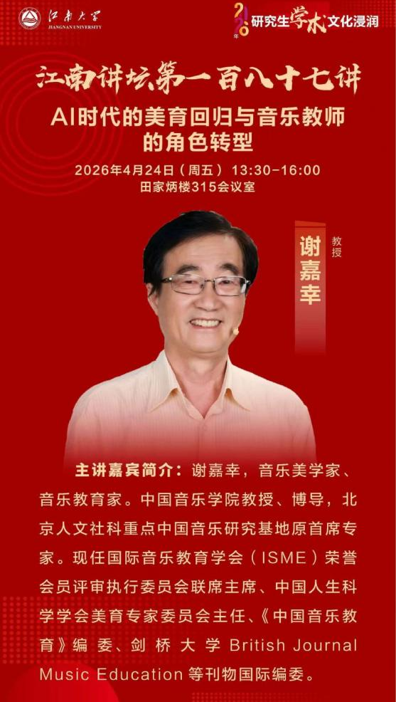 在田家炳楼315教室举办江南讲坛第一百八十七讲。著名音乐美学家、音乐教育家谢嘉幸教授应邀作题为《AI时代的美育回归与音乐教师的角色转型》 的学术讲座,围绕人工智能时代教育变革、美育价值重塑与音乐教师专业发展等核心议题进行深度阐释与学术引领。