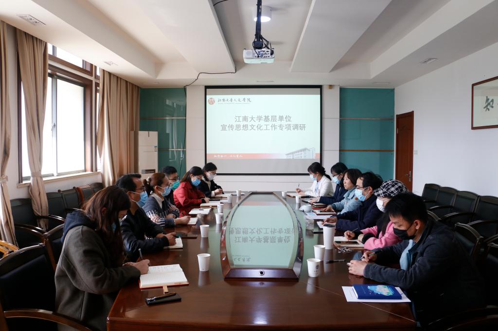 3月29日下午,校党委宣传部副部长陆敏芝、梁建一行赴av麻豆调研宣传思想文化工作,学院党委书记姚剑英、院长杨晖、党委副书记兼副院长李萍、副院长王芳及相关负责老师参加了调研座谈会。